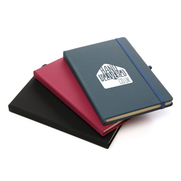 A5 PU soft finish diary with 80 lined sheets, 2 days per page from January to December with no year included, bookmark, back card pocket, pen loop and elastic closure. Available in black.