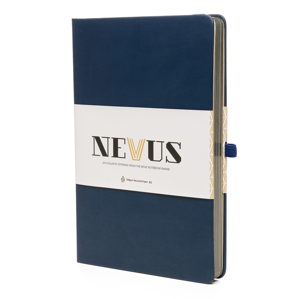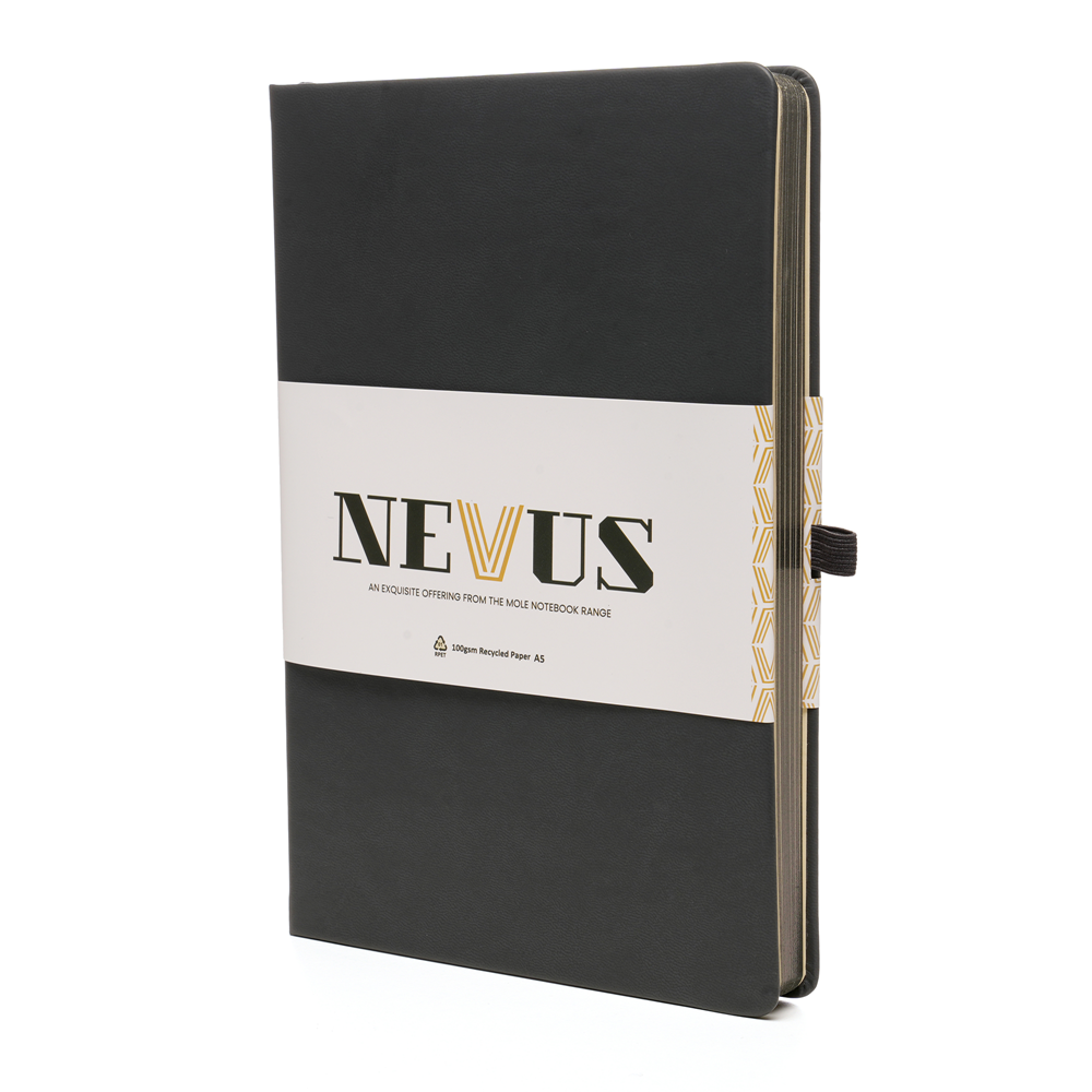 A Premium A5 Nevus notebook that gives back! The outer cover is made from Recycled PU and features a sturdy 950gsm recycled cardboard inner cover, ensuring durability while reducing environmental impact. Inside, you will find 80 perforated sheets of 100gsm cream recycled paper featuring gun metal edging for a premium touch, each lined for neat and organised note-taking. To enhance functionality, this notebook is equipped with a convenient back pocket for storing loose papers and notes. It also comes with polyester double ribbons, providing markers for easy page reference. The elastic band closure secures your notes and keeps everything in place, while the pen loop with gun metal stud ensures you always have a writing instrument at hand. Whether for work, school, or personal use, this notebook is a perfect giveaway and an ideal promotional tool for any occasion and business. In addition to its practicality and recycled materials, this notebook also gives back. For every purchase made, 10p is donated to the 'Helping Uganda Schools Charity', supporting a great cause while you jot down your thoughts and ideas. Make a difference with every page you fill in this thoughtfully designed notebook. Order yours today!