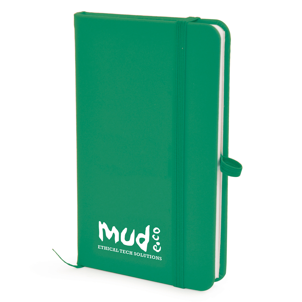 A6 soft finish notebook with 80 lined sheets, elastic closure back pocket and bookmark and pen loop.