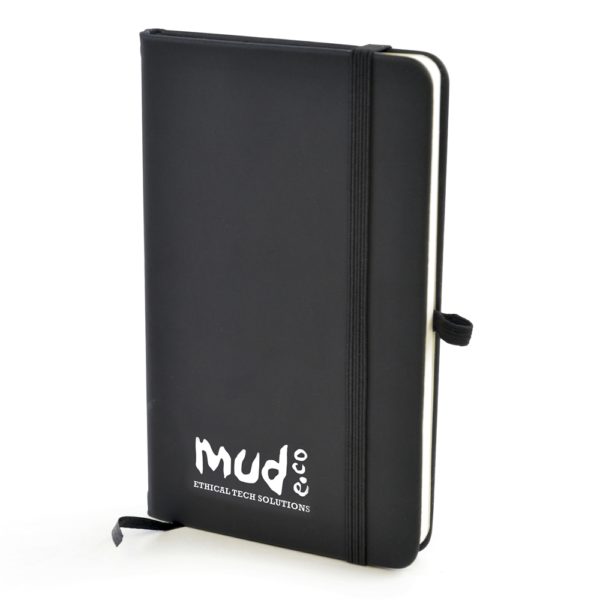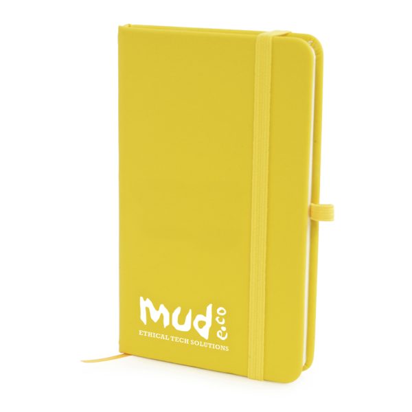 A6 soft finish notebook with 80 lined sheets, elastic closure back pocket and bookmark and pen loop.