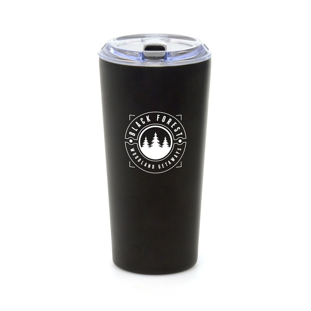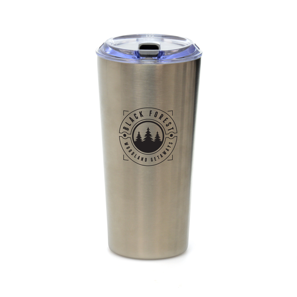 Promotional 500ml double walled stainless steel tumbler with a clear plastic push on lid and handy black plastic sliding sipper to prevent spills. The double walled design with a stainless steel inner means this custom tumbler will keep your drinks hot or chilled as you need it ? great for around the office or on the go. The sleek, simple and sturdy stainless steel design will complement any company logo and offers a large branding area to carry your message. It would make a great promotional gift for corporate clients, perfect to keep the morning coffee hot on the commute to work whilst helping to prevent the purchase of single-use coffee cups. These tumblers have a very long life span, used time and time again until eventually being recycled. The lid contains PP plastic, AS plastic and silicone seal. BPA and PVC free. Choose from black or silver and order yours today.