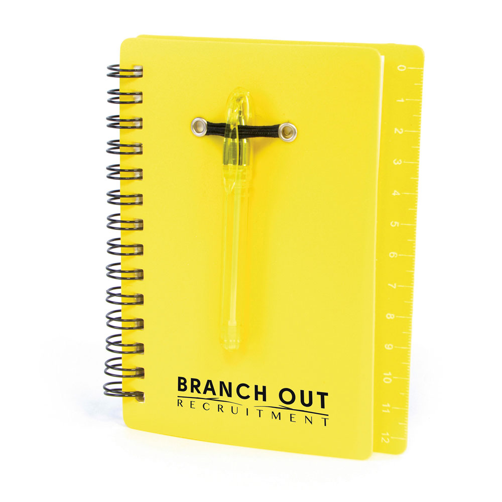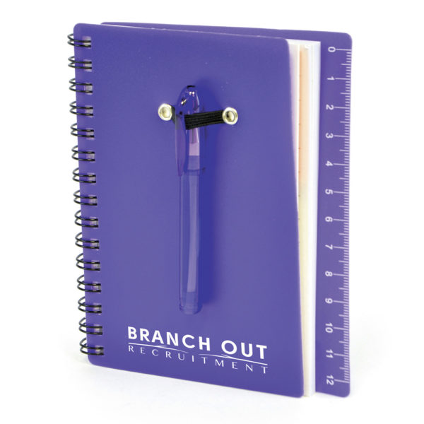 Spiral bound notebook with ball pen, flag set and back cover ruler. Available in 8 colours. Black ink