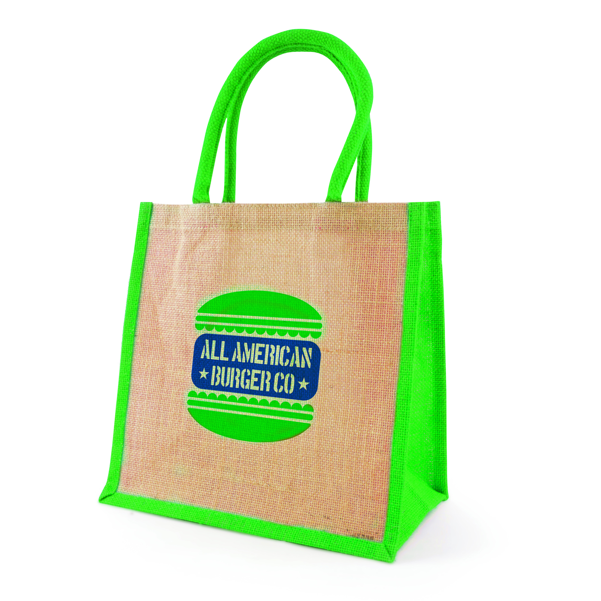 Natural, jute bag with gusset, rope handles, jute trim and laminated backing. Available in 7 colours.