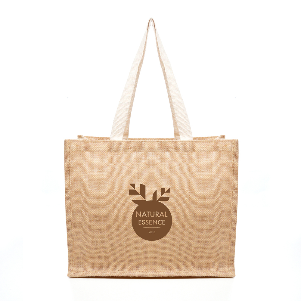 Take your companies branding to the next level with this sleek and timeless natural jute shopper. Made with a laminated finish and designed to stand out, this bag is perfect for showcasing your logo with style and impact. Equipped with long flat cotton webbing handles for added comfort and durability, its built to handle daily errands, grocery trips, and more making it a reliable go-to for your customers. Customise it with your companys logo and ensure maximum brand visibility. Whether youre distributing them at trade shows, events, or offering them as promotional gifts, these shoppers are a proven way to keep your brand top of mind. Order today and be sure to leave a lasting impression!