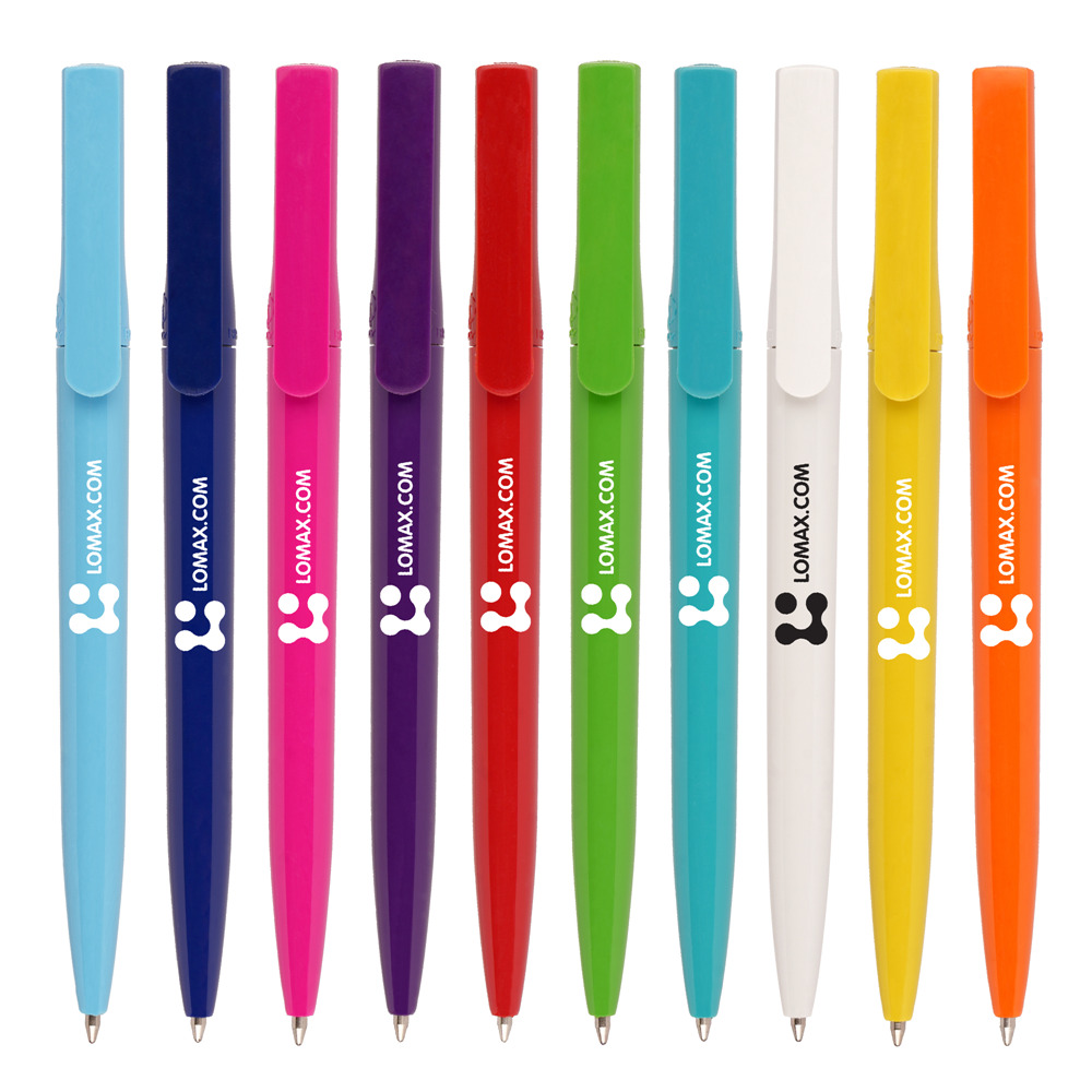 Quality twist action solid colour ball pen made in Europe from recycled PET from used water bottles.