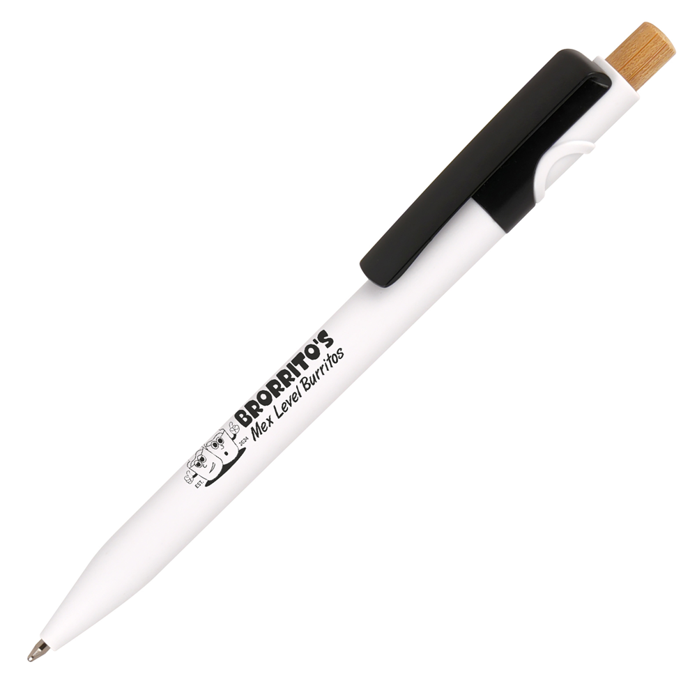 Promote your brand with this customisable ball pen made from ocean-bound, recycled plastic. Perfect for corporate merchandise, trade shows, exhibitions, and events, it features a sleek white barrel, colourful trim, and a distinctive plunger made from bamboo. The barrel of the pen boasts a generous branding area that can be printed with your company logo - ideal for advertising and brand merchandising. Recycled symbols pre-printed to the back of the pen. Order yours today!